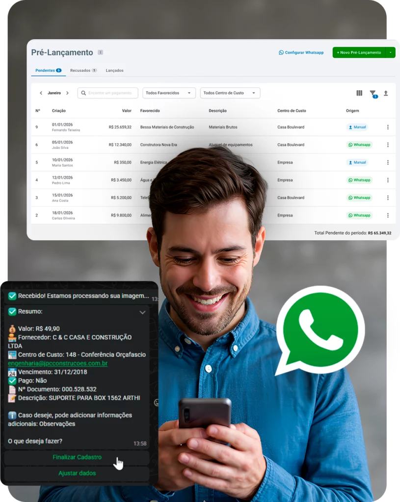 A equipe de obra envia foto, áudio ou texto. A IA preenche, o financeiro só valida.