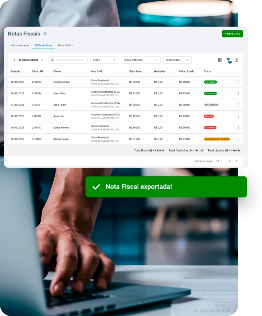 Emita notas de serviço sem sair do fluxo financeiro. Sem portal da prefeitura.
