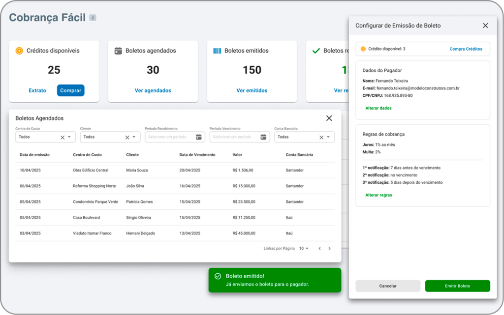 Geração de boletos bancários de forma integrada com sua conta; notificação do pagador de forma automática (por e-mail ou WhatsApp); além da baixa automática no sistema.