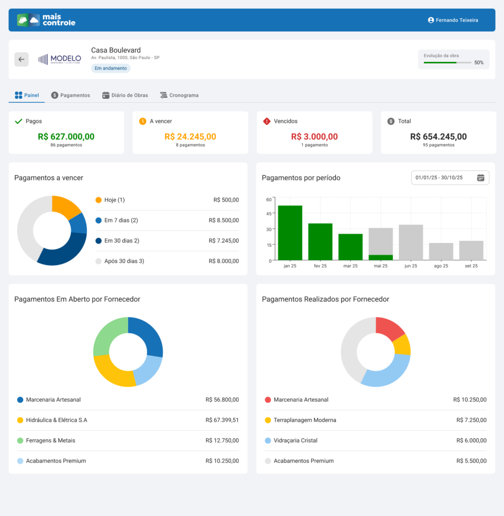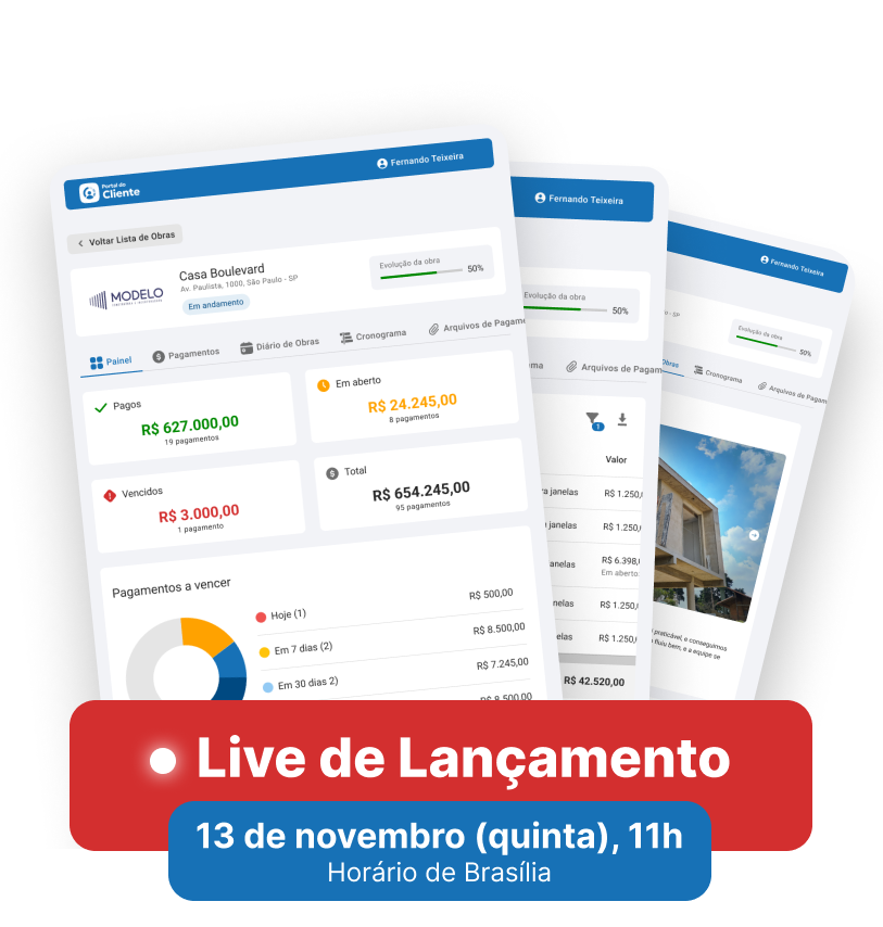 Prestação de contas automatizada, comunicação centralizada e seu cliente no controle das informações da obra.
