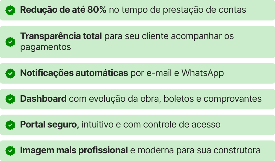 O Portal do Cliente é ideal para construtoras que trabalham com obras por administração ou com investidores e querem: